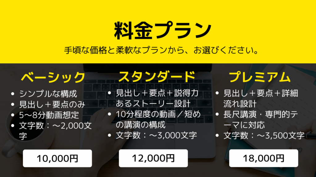 - 追加料金:文字数が1,000文字増えるごとに+3,000円(動画台本・音声スクリプト・セミナー資料いずれも共通)