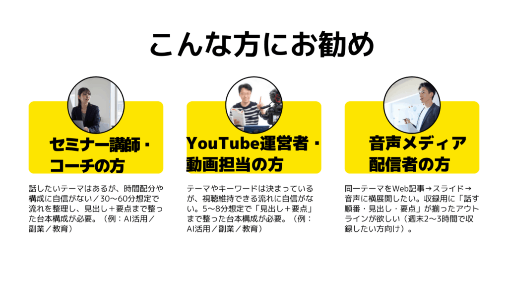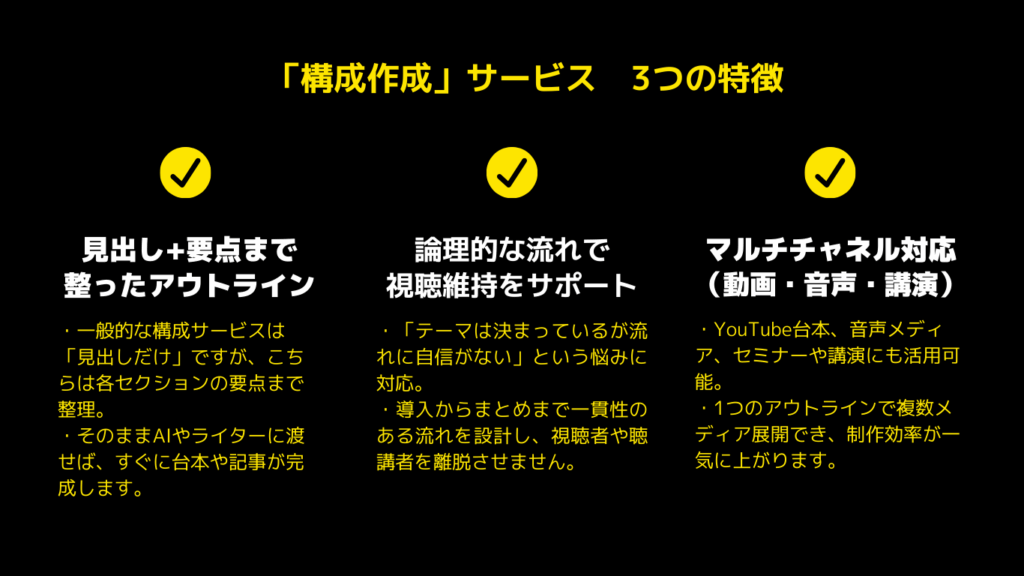 - 本サービスは構成・台本設計に特化しています(本文執筆・編集は含みません)。