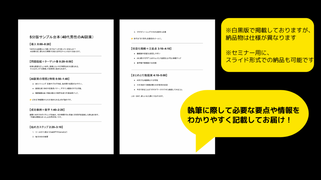 各パートの要点まで整理されているため、AIに書かせても、人間が執筆しても、すぐに台本や記事が完成します。