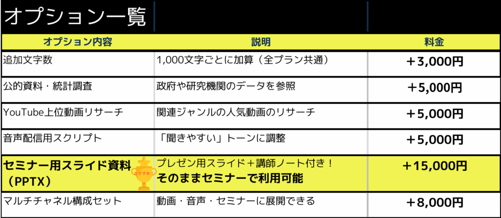 さらにオプションで、YouTube上位動画のリサーチや音声メディア向け構成にも対応。