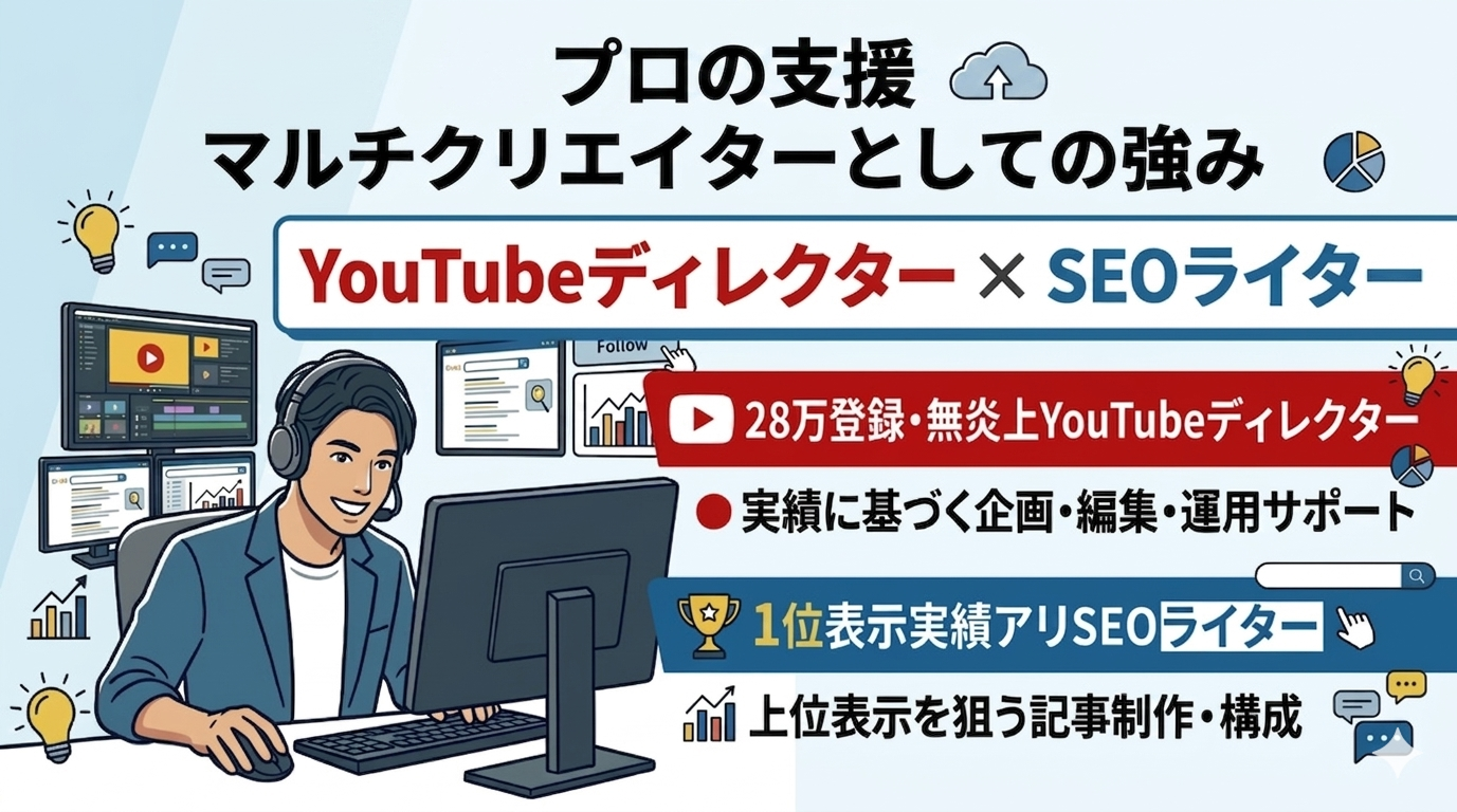 28万登録&SEO1位のディレクター・ライターによるYouTube設計サポート
